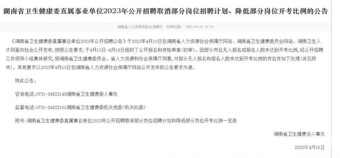 今年4月,湖南省卫生健康委人事处发布公告称,因无人报名或报名人数不足,部分岗位要取消招聘,或降低开考比例。