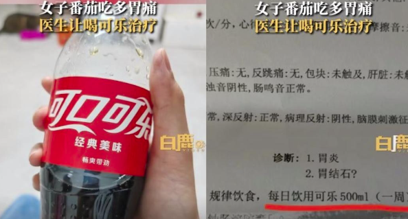 江苏南京有1名许姓女子日前因为疯狂吃西红柿,导致胃部突然产生剧烈的灼痛感,时不时还会反胃、想吐。为了缓解症状,她决定前往医院检查治疗,没想到医生在替她诊断后,竟开出「每日饮用可乐500ml」的药方。更令许女感到惊讶的是,她还真的靠这招解决了腹痛问题。