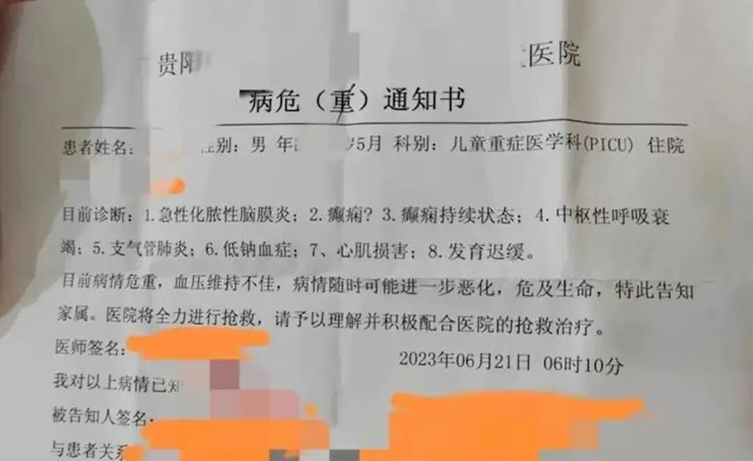 男童转入医院深切治疗部治疗后,医院于6月21日下达病危通知书,通知书显示医院诊断男童患有急性化脓性脑膜炎,出现持续癫痫、中枢性呼吸衰竭、支气管肺炎等症状。男童病情危重,血压维持不足,病情随时可能进一步恶化,危及生命。