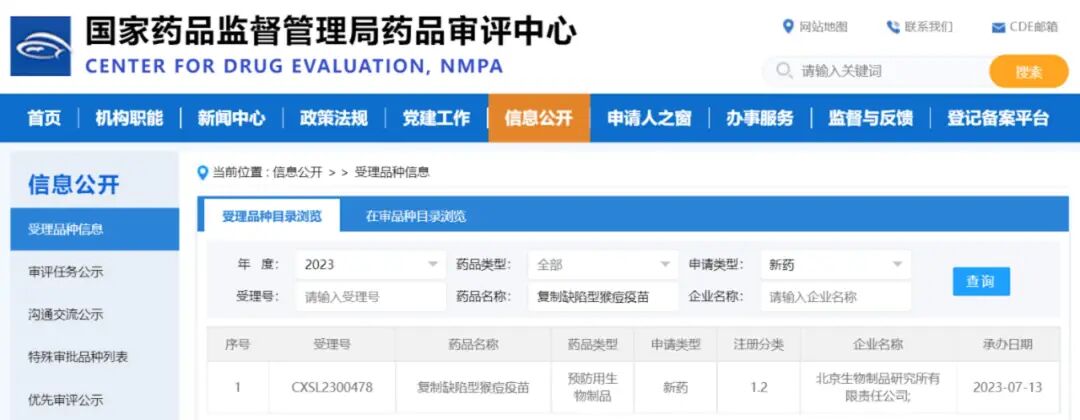 中国生物研发的复制缺陷型猴痘疫苗临床试验申请获受理。(国家药品监督管理局药品审评中心)