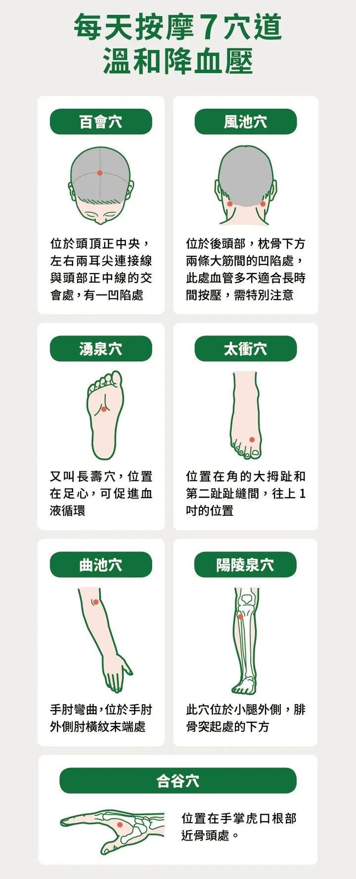 中医的穴道按摩也有降血压的功效,虽然效果不如西药快,但是是一种较温和的调整血压方式。以下介绍几个重要穴位。