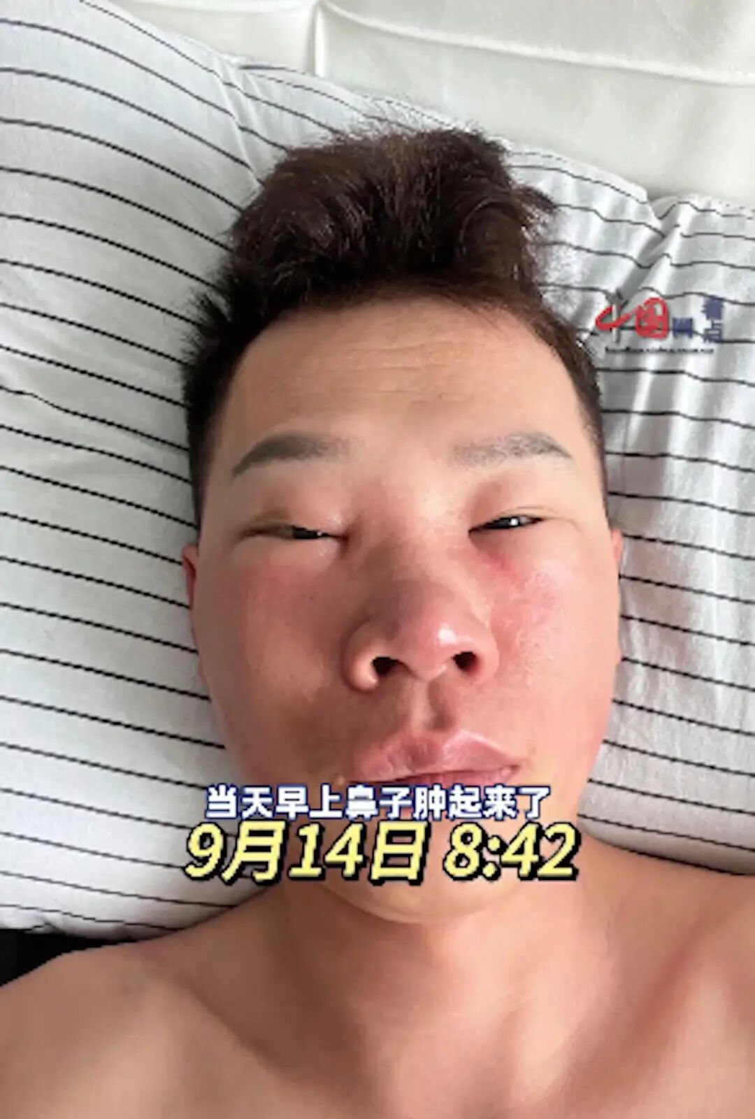 及至翌日,郑男的整个面部肿胀,眼睛睁不开,疼痛感明显,即时赴医院就诊,最终被诊断出感染丹毒。网传照片显示,他的眼皮红肿到眼睛只能睁开一缝,嘴唇变成「香肠嘴」,面部皮肤还伴有甩皮。
