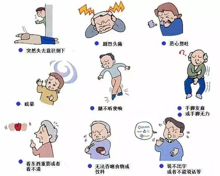 如果突然一只手或一只脚举不起来但没有伴随痛或麻,或者出现间歇性跛行、癫瘸,严重晕眩,走路不稳、不想说话或口齿不清,头痛,呕吐、恶心、怕光、怕吵,视力模糊,复视,突然一边看不清楚,视野有盲斑扩散、视物变形,耳朵一边突然听不到,等等症状也都是中风的症状。