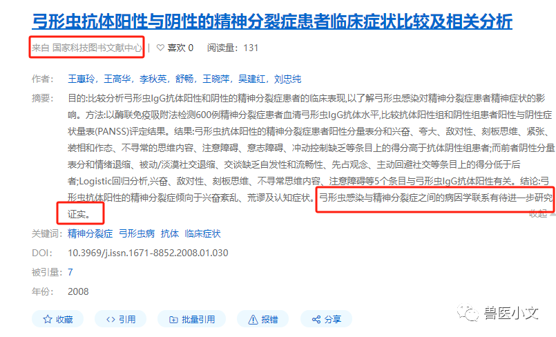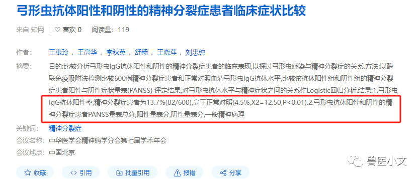 例如,一项对美国近4000名精神分裂症患者和正常对照进行血清学检测的研究发现,在精神分裂症患者中,弓形虫抗体阳性率为10.8%,而在正常对照中为10.6%,两者之间没有显著差异。