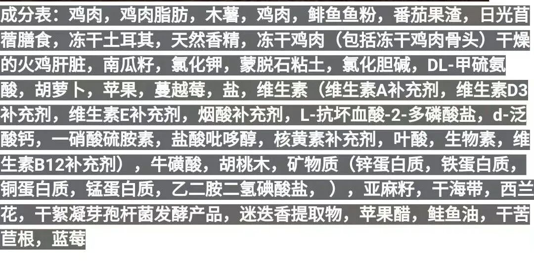 根据图片的成分来看,这款猫粮包含了以下成分:成分表:鸡肉,鸡肉脂肪,木薯,鸡肉,鲱鱼鱼粉,番茄果渣,日光苜蓿膳食,冻干土耳其,天然香精,冻干鸡肉(包括冻干鸡肉骨头)干燥的火鸡肝脏,南瓜籽,氯化钾,蒙脱石粘土,氯化胆碱,DL-甲硫氨酸,胡萝卜,苹果,蔓越莓,盐,维生素(维生素A补充剂,维生素D3补充剂,维生素E补充剂,烟酸补充剂,L-抗坏血酸-2-多磷酸盐,d-泛酸钙,一硝酸硫胺素,盐酸吡哆醇,核黄素补充剂,叶酸,生物素,维生素B12补充剂),牛磺酸,胡桃木,矿物质(锌蛋白质,铁蛋白质,铜蛋白质,锰蛋白质,乙二胺二氢碘酸盐, ),亚麻籽,干海带,西兰花,干絮凝芽孢杆菌发酵产品,迷迭香提取物,苹果醋,鲑鱼油,干苦苣根,蓝莓。以下为详细分析:
