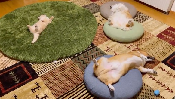 事实上,当猫妹妹来到家里后,家里确实看上去是一副岁月静好的磨样,狗子不仅比平常乖很多,比如这三的睡姿....