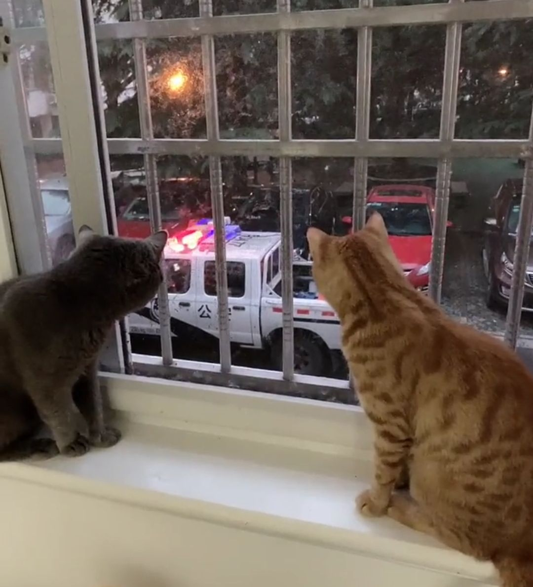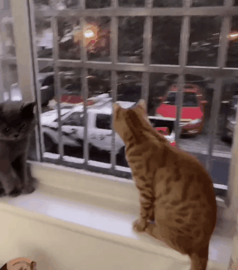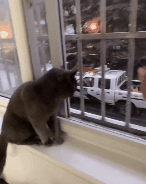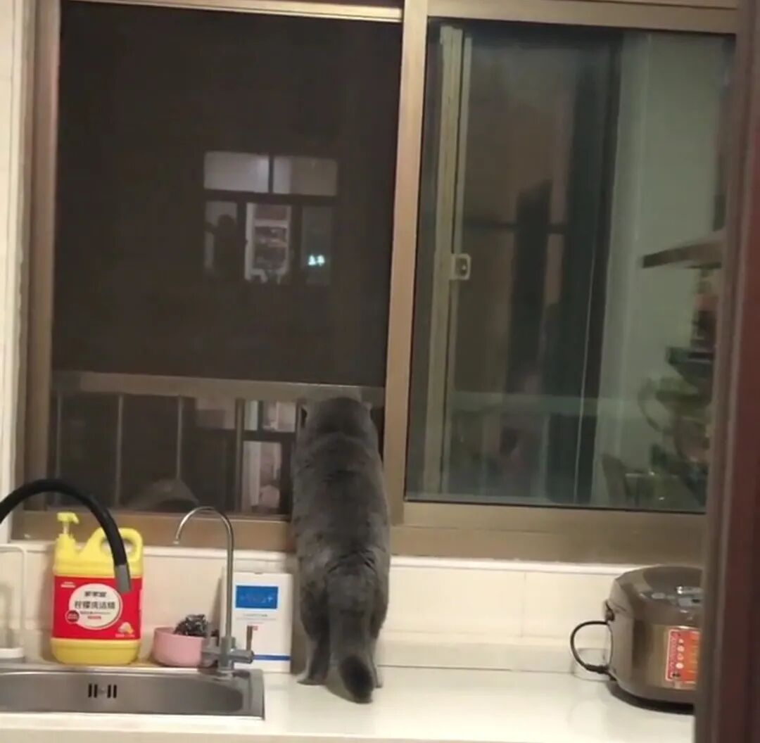 彷佛在说,铲屎的快来,你看对面的人也爱看,好像要打起来了呢....