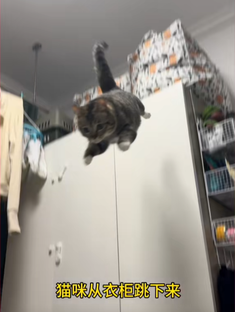 小猫咪从柜子上,一跃而下,好死不死的那么刚刚好踩在了妹子的身上...