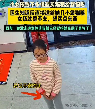小女孩的回复和表情瞬间就击中了医生的,于是医生顺手拿起两包猫粮,对小女孩说,给流浪猫吃拿这个,并表示不要钱...
