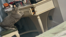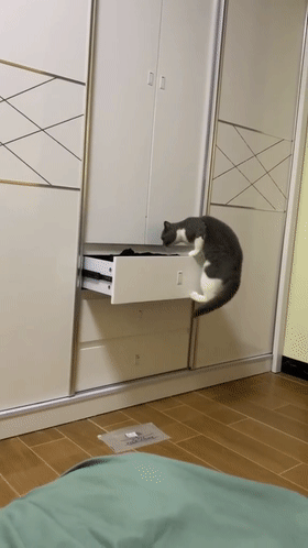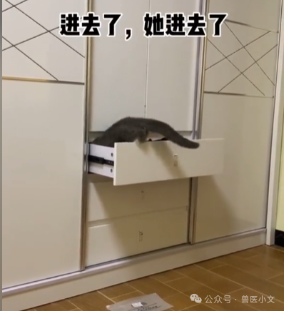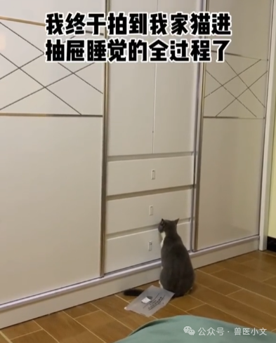 同样是开抽屉,网友@小肥杨家的更惊悚,据网友介绍,自家的喵是惯犯,而下面这一出,是网友多次努力后,成功的拍到猫进抽屉睡觉的全过程了.....对了,小肥杨家的猫还会自己把抽屉关上.....是成精了吗?