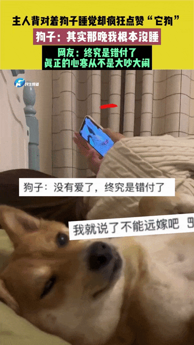 据民生频道报导,4月22日河南:主人背对着狗子睡觉却疯狂点赞“它狗”,但却被狗子看见了,一番心碎要哭的小表情被记录了下来..