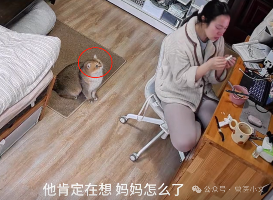 当小猫咪发现主人悲伤落泪后,迅速起身,从侧面看看麻麻在干什么~
