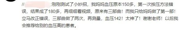 网友:刚刚测试了小妙招,我妈妈血压原本150多,第一次按压方法错误,结果成了180多,再细细看视频,原来有三部曲!而我只给妈妈做了第一部!立马改正错误,三部曲做了两次,再测量,血压142!太神了!谢谢老师!以后我会推荐给别的血压高的患者。