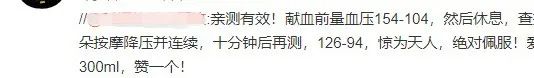网友:亲测有效!献血前量血压154-104,然后休息,查找张老师耳朵按摩降压并连续,十分钟后再测,126-94,惊为天人,绝对佩服!爱心献血300ml,赞一个!