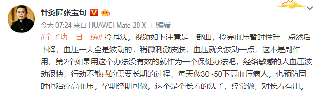 即使用这个方法没有产生降压效果,也可以作为保健法来使用。经络敏感的人血压波动很快,经络不敏感的人则需要长期的过程,经常做有利于长寿。孕期经期可做。