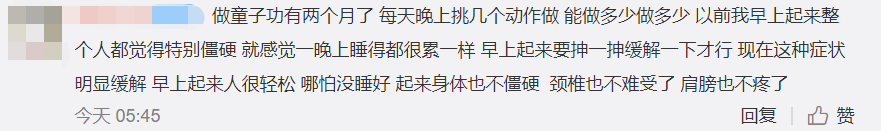 网友:做童子功有两个月了,每天晚上挑几个动作做,能做多少就做多少。以前我早上起来整个人都觉得特别僵硬,就感觉一晚上睡得都很累,早上起来要抻一抻缓解一下才行。现在这种症状明显缓解,早上起来人很轻松,哪怕没睡好,起来身体也不僵硬,颈椎也不难受了,肩膀也不疼了。