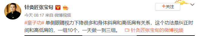 张老师:单侧眼睛视力下降,很多与身体斜肩和高低肩有关系,这个功法是纠正斜肩和高低肩的。一组10个,一天做1~3组。