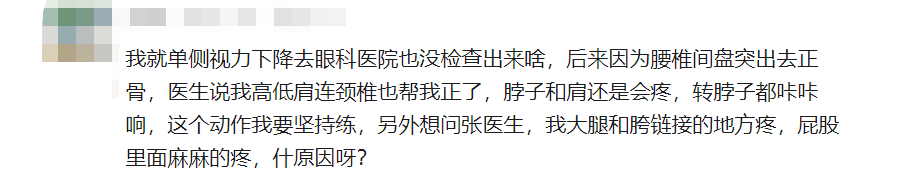 网友:我就单侧视力下降去眼科医院也没检查出来啥,后来因为腰椎间盘突出去正骨,医生说我高低肩连颈椎也帮我正了,脖子和肩还是会疼,转脖子都咔咔响,这个动作我要坚持练。