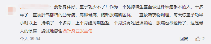 网友:要想身体好,童子功少不了!作为一个乳腺增生甚至做过纤维瘤手术的人,十多年了一直被肝气郁结的肋骨痛,肩胛骨痛,胸部胀痛所困扰,一直依赖药物调理。每天练童子功半小时以上,持续了一个多月,上个月经周期整整一个月没有吃逍遥颗粒,胀痛也很轻微了,这是最大的惊喜!虔诚地感谢。