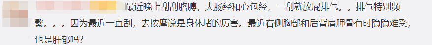网友:最近晚上刮刮胳膊,大肠经和心包经,一刮就放屁排气。。排气特别频繁。。。因为最近一直刮,去按摩说是身体堵的厉害。最近右侧胸部和后背肩胛骨有时隐隐难受,也是肝郁吗?