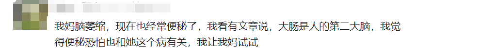 网友:我妈脑萎缩,现在也经常便秘了,我看有文章说,大肠是人的第二大脑,我觉得便秘恐怕也和她这个病有关,我让我妈试试。
