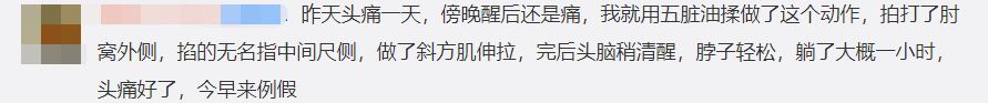网友:昨天头痛一天,傍晚醒后还是痛,我就用五脏油揉做了这个动作,拍打了肘窝外侧,掐的无名指中间尺侧,做了斜方肌伸拉,完后头脑稍清醒,脖子轻松,躺了大概一小时,头痛好了,今早来例假。