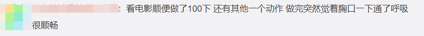 网友:看电影时顺便做了100下,还有其他一个动作,做完突然觉着胸口一下通了,呼吸很顺畅。