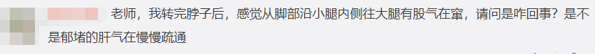 网友:老师,我转完脖子后,感觉从脚部沿小腿内侧往大腿有股气在窜,请问是咋回事?是不是瘀堵的肝气在慢慢疏通?