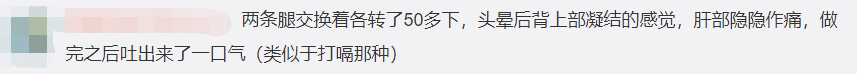 网友:两条腿交换着各转了50多下,头晕、后背上部有凝结的感觉,肝部隐隐作痛,做完之后吐出来了一口气(类似于打嗝那种)。