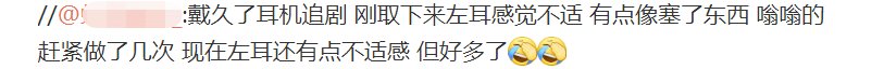 网友:戴久了耳机追剧 刚取下来左耳感觉不适 有点像塞了东西 嗡嗡的 赶紧做了几次 现在左耳还有点不适感 但好多了。