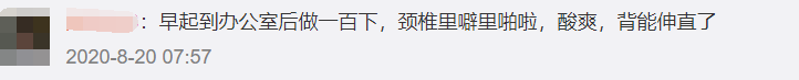 网友:早期到办公室后做一百下,颈椎里噼里啪啦,酸爽,背能伸直了。