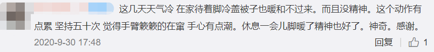 网友:这几天天气冷,在家待着脚冷,盖被子也暖和不过来,而且没精神。这个动作有点累,坚持五十次觉得手臂簌簌的在窜,手心有点潮。休息一会儿脚暖了精神也好了。神奇。
