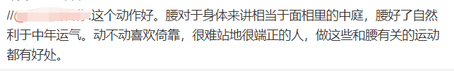 网友:这个动作好。腰对于身体来讲相当于面相里的中庭,腰好了自然利于中年运气。动不动喜欢倚靠,很难站地很端正的人,做这些和腰有关的运动都有好处。