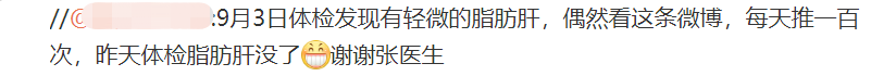 网友:9月3日体检发现有轻微的脂肪肝,偶然看这条微博,每天推一百次,昨天体检脂肪肝没了谢谢张医生。(一个多月后)