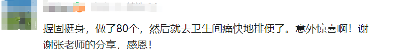 网友:握固挺身,做了80个,然后就去卫生间痛快地排便了。意外惊喜啊!谢谢张老师的分享,感恩!