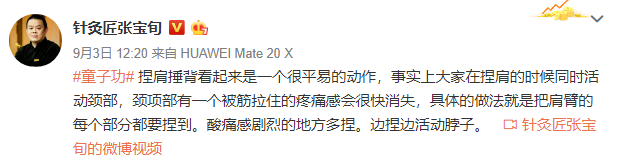 张老师:捏肩捶背看起来是一个很平易的动作,事实上大家在捏肩的时候同时活动颈部,颈项部有一个被筋拉住的疼痛感会很快消失,具体的做法就是把肩臂的每个部分都要捏到。酸痛感剧烈的地方多捏。边捏边活动脖子。