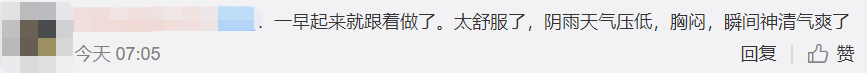 网友:一早起来就跟着做了。太舒服了,阴雨天气压低,胸闷,瞬间神清气爽了。