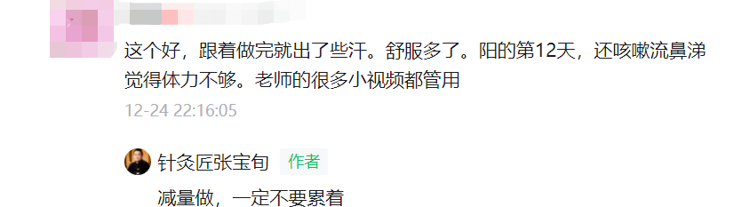 网友:这个好,跟着做完就出了些汗。舒服多了。阳的第12天,还咳嗽流鼻涕觉得体力不够。老师的很多小视频都管用。