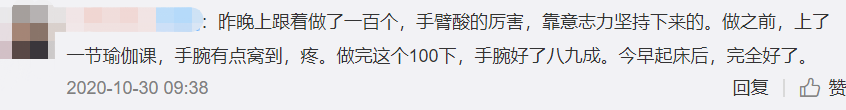 网友:昨晚上跟着做了一百个,手臂酸的厉害,靠意志力坚持下来的。做之前,上了一节瑜伽课,手腕有点窝到了,疼。昨晚这个100下,手腕好了八九成,今早起床后,完全好了。