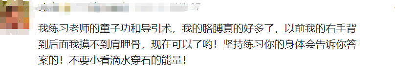 网友:我练习老师的童子功和导引术,我的胳膊真的好多了,以前我的右手背到后面我摸不到肩胛骨,现在可以了哟!坚持练习你的身体会告诉你答案的!不要小看滴水穿石的能量!