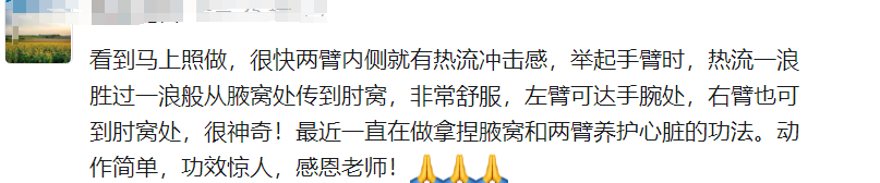 网友:看到马上照做,很快两臂内侧就有热流冲击感,举起手臂时,热流一浪胜过一浪般从腋窝处传到肘窝,非常舒服,左臂可达手腕处,右臂也可到肘窝处,很神奇!最近一直在做拿捏腋窝和两臂养护心脏的功法。动作简单,功效惊人,感恩老师!