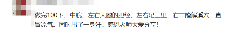 网友:做完100下,中脘、左右大腿的胆经,左右足三里,右丰隆解溪穴一直冒凉气。同时出了一身汗。感恩老师大爱分享!