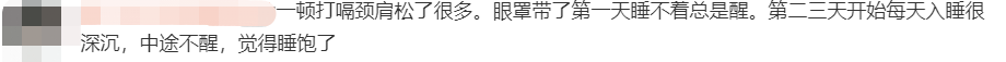 网友:一顿打嗝颈肩松了很多。眼罩带了第一天睡不着总是醒。第二三天开始每天入睡很深沉,中途不醒,觉得睡饱了。