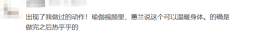 网友:出现了我做过的动作!瑜伽视频里,蕙兰说这个可以温暖身体。的确是做完之后热乎乎的。