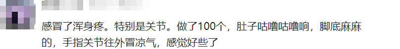 网友:感冒了浑身疼。特别是关节。做了100个,肚子咕噜咕噜响,脚底麻麻的,手指关节往外冒凉气,感觉好些了。