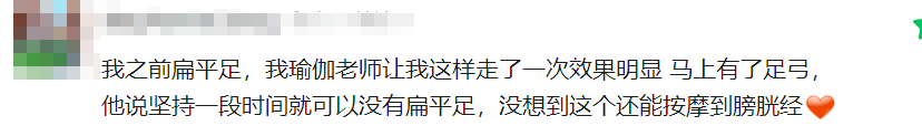 网友:我之前扁平足,我瑜伽老师让我这样走了一次效果明显 马上有了足弓,他说坚持一段时间就可以没有扁平足,没想到这个还能按摩到膀胱经。