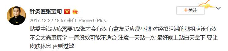 张老师:贴委中治痔疮需要1/2张才会有效,有盆友反应瘦小腿,对经络阻滞应该有效,不要太高重复率,一周没效可能就不适合了。注意一天贴一次, 最好晚上贴,白天拿下来,要让皮肤休息,否则会过敏。