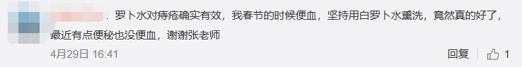 网友:萝卜水对痔疮确实有效,我春节的时候便血,坚持用白萝卜水熏洗,竟然真的好了,最近有点便秘也没有便血,谢谢张老师。