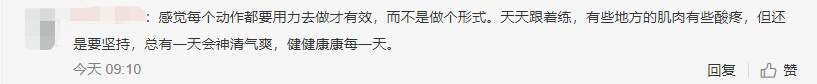 网友:感觉每个动作都要用力去做才有效,而不是做个形式。天天跟着练,有些地方的肌肉有些酸疼,但还是要坚持,总有一天会神清气爽,健健康康每一天。