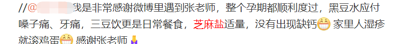 网友:我是非常感谢微博里遇到张老师,整个孕期都顺利度过,黑豆水应付嗓子痛、牙痛,三豆饮更是日常餐食,芝麻盐适量,没有出现缺钙 家里人湿疹就滚鸡蛋 感谢张老师。
